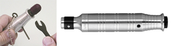手前と先端部を握り前後に押し引きすることで、先端ツールの着脱を行います。樹脂製のハンドピースは軽く握り易く、さらにハンドピースの上部には柔軟性の高いスプリングを使用しているため手首に負担を掛けません。 2.35mm軸専用 軽負荷作業向き。 |